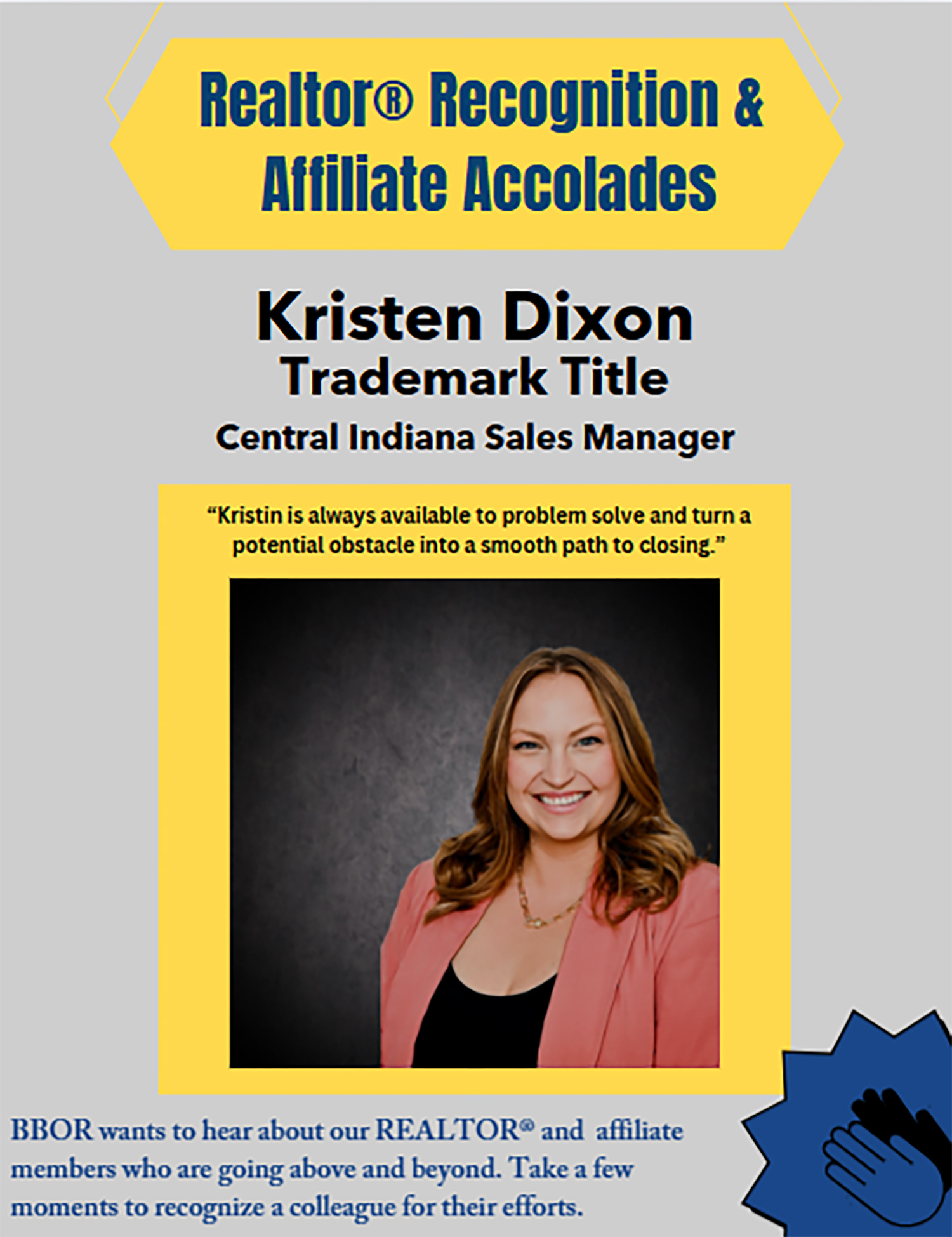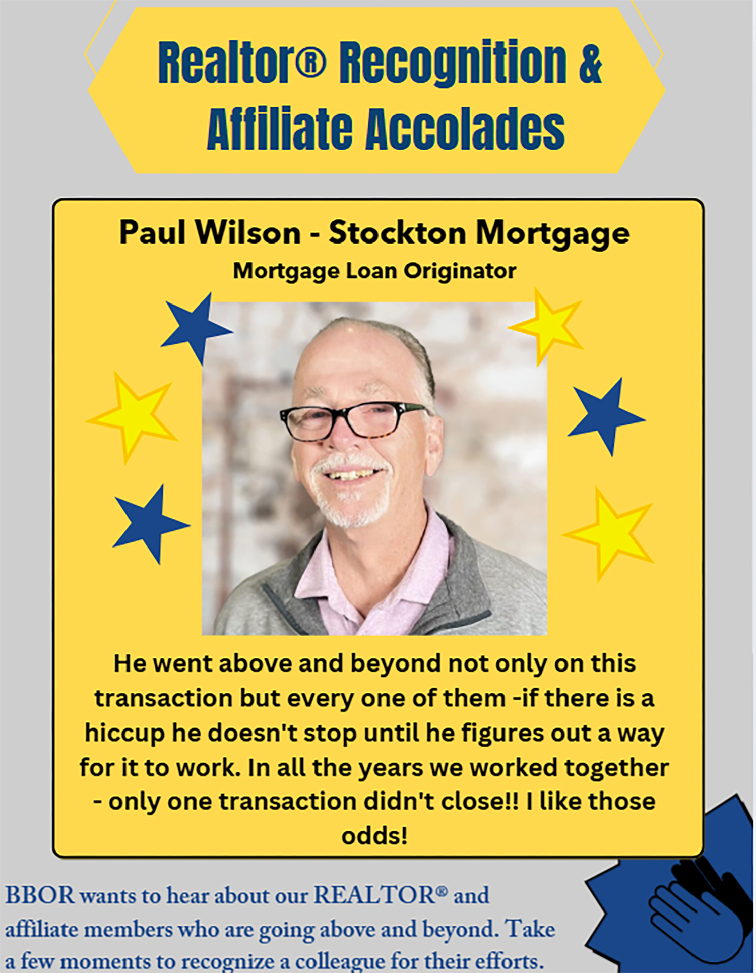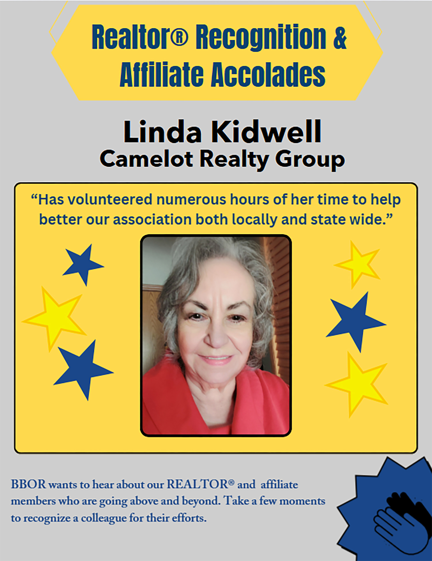 Every day, BBOR Realtors® and Affiliates go the extra mile—not just in their work, but in their service to clients, colleagues, and the community. The Realtor® Recognition & Affiliate Accolades celebrate those who stand out for their dedication, professionalism, and positive impact. Know someone who deserves the spotlight? Nominate a BBOR Realtor® or Affiliate by clicking the link below and sharing what makes them exceptional.